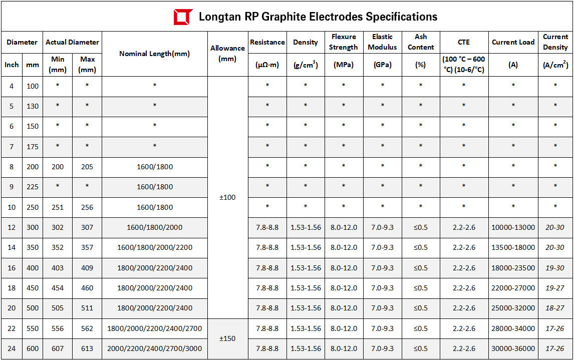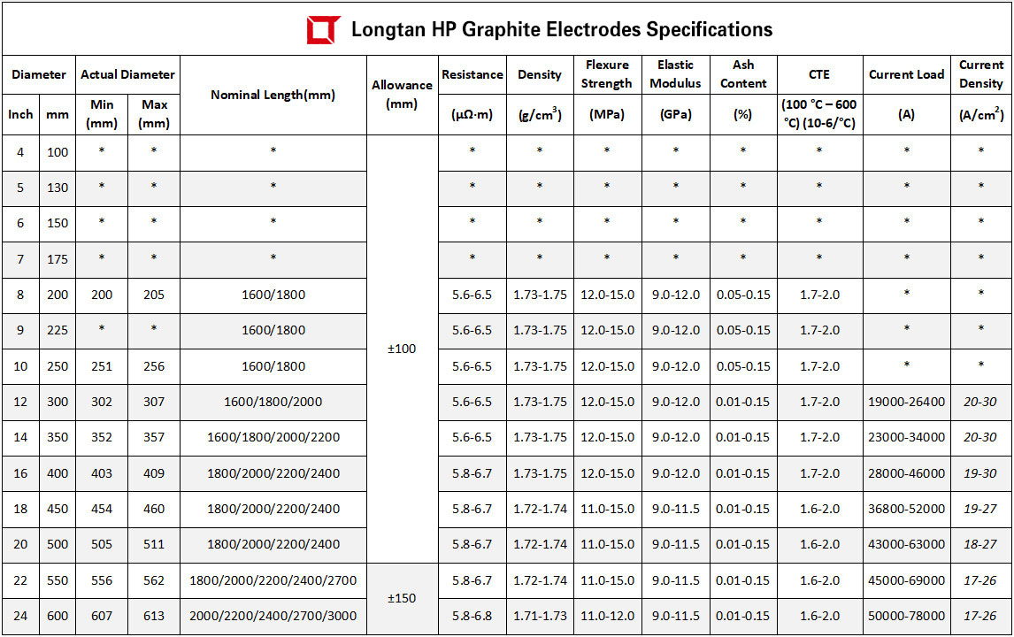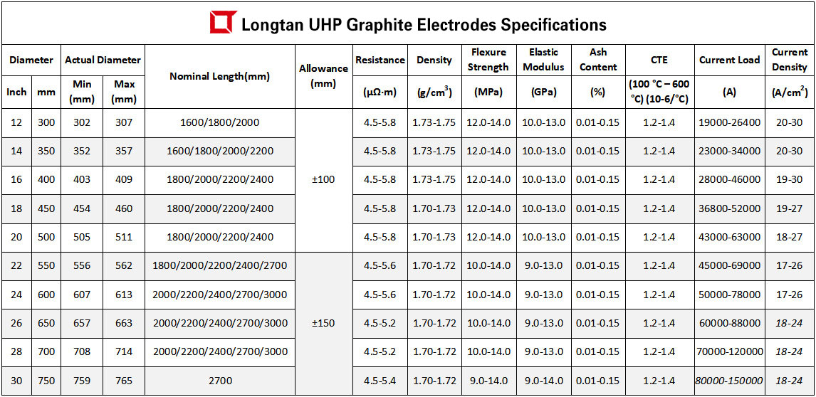 The Ultra High Power (UHP) Graphite Electrodes produced by longtan Carbon Group adopts 100% high quality imported needle coke, advanced production equipment and technology, and is produced in strict accordance with the world class standard, the Ultra-high Power (UHP) Graphite Electrode has lower resistivity, better electrical conductivity and higher mechanical strength. The Graphite Electrode Nipples are made of 100% imported needle coke with three times impregnation and four times baking process.The product quality has approached or reached the world-class standard, which can meet the needs of various Ultra-high Power (UHP) Electric Arc Furnace (EAF) and Ladle Refining Furnace (LRF) steelmaking.